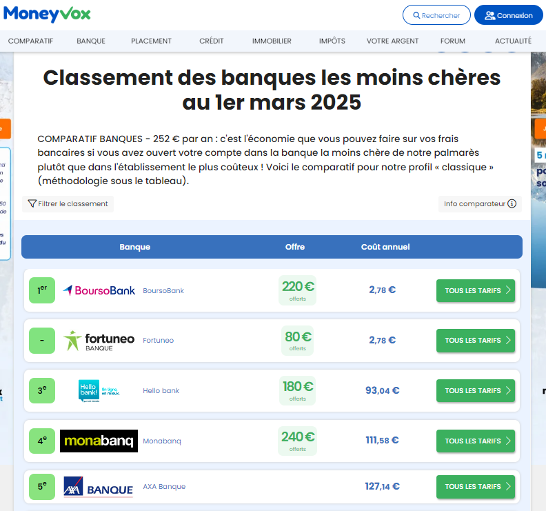 Pour établir ce classement, le comparateur en ligne Moneyvox a simulé le comportement bancaire type d'un client français, en considérant ses opérations courantes (retraits, paiements, découverts,...). Ces critères ont été établis discrétionnairement par Moneyvox, sans concertation avec Fortuneo. Les tarifs de 120 banques ont ensuite été comparés en fonction de ce profil standard. Les offres groupées (paquets de services), ainsi que les tarifs à la carte ont été pris en compte. Le classement est mis à jour régulièrement pour refléter les évolutions des offres bancaires. Il est important de noter que ce classement est une photographie à un instant T et que les conditions peuvent évoluer. Pour une information plus détaillée sur les tarifs d'une banque en particulier, vous pouvez les consulter directement sur son site Internet.